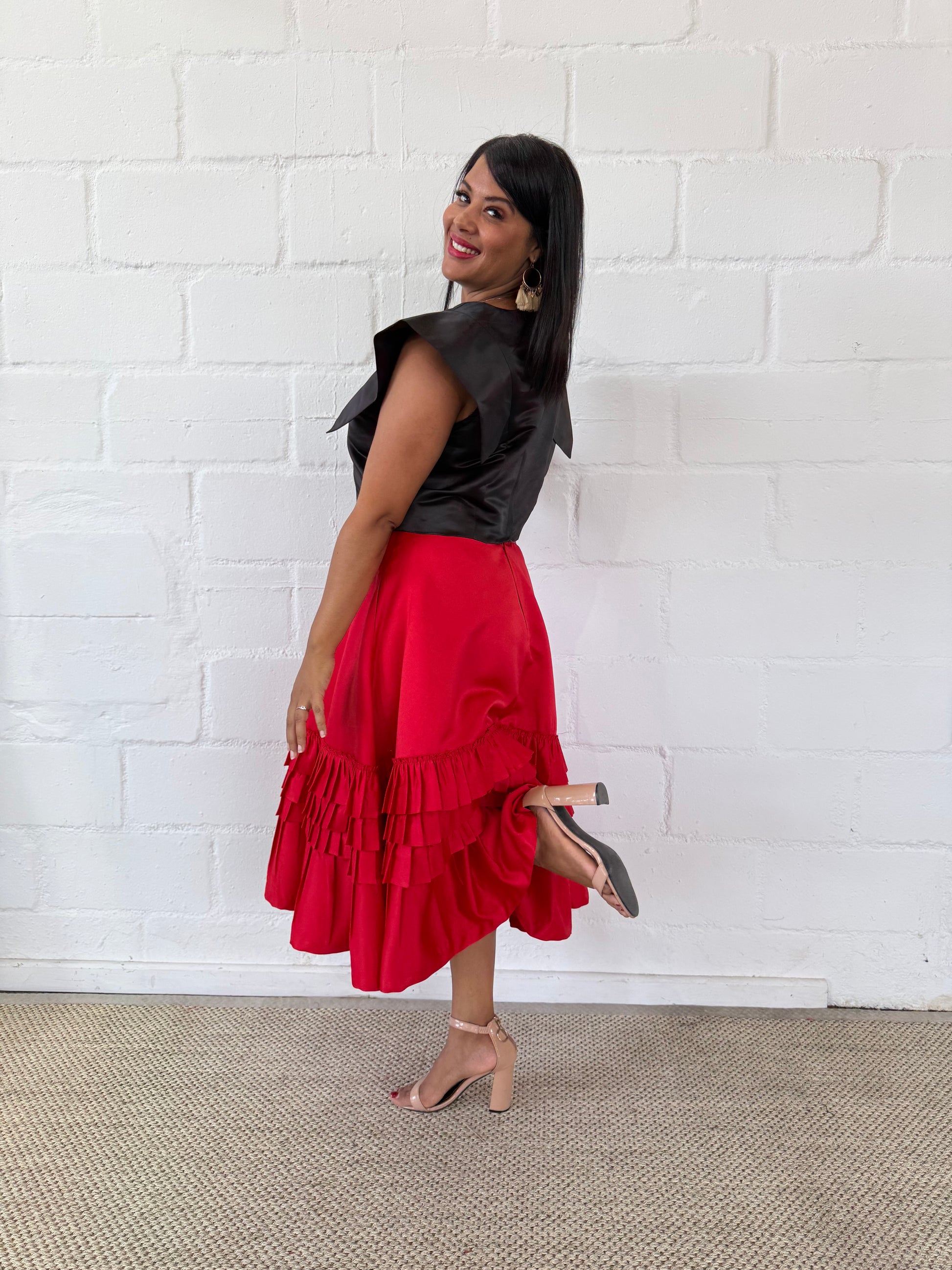 Style it with high-waisted trousers or the matching RED or BLACK VALENTINE SKIRT for an elevated day-to-night look.