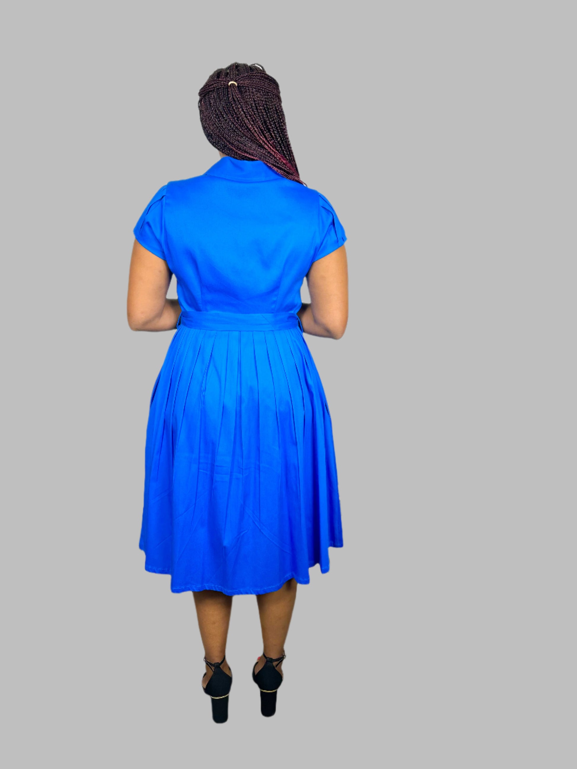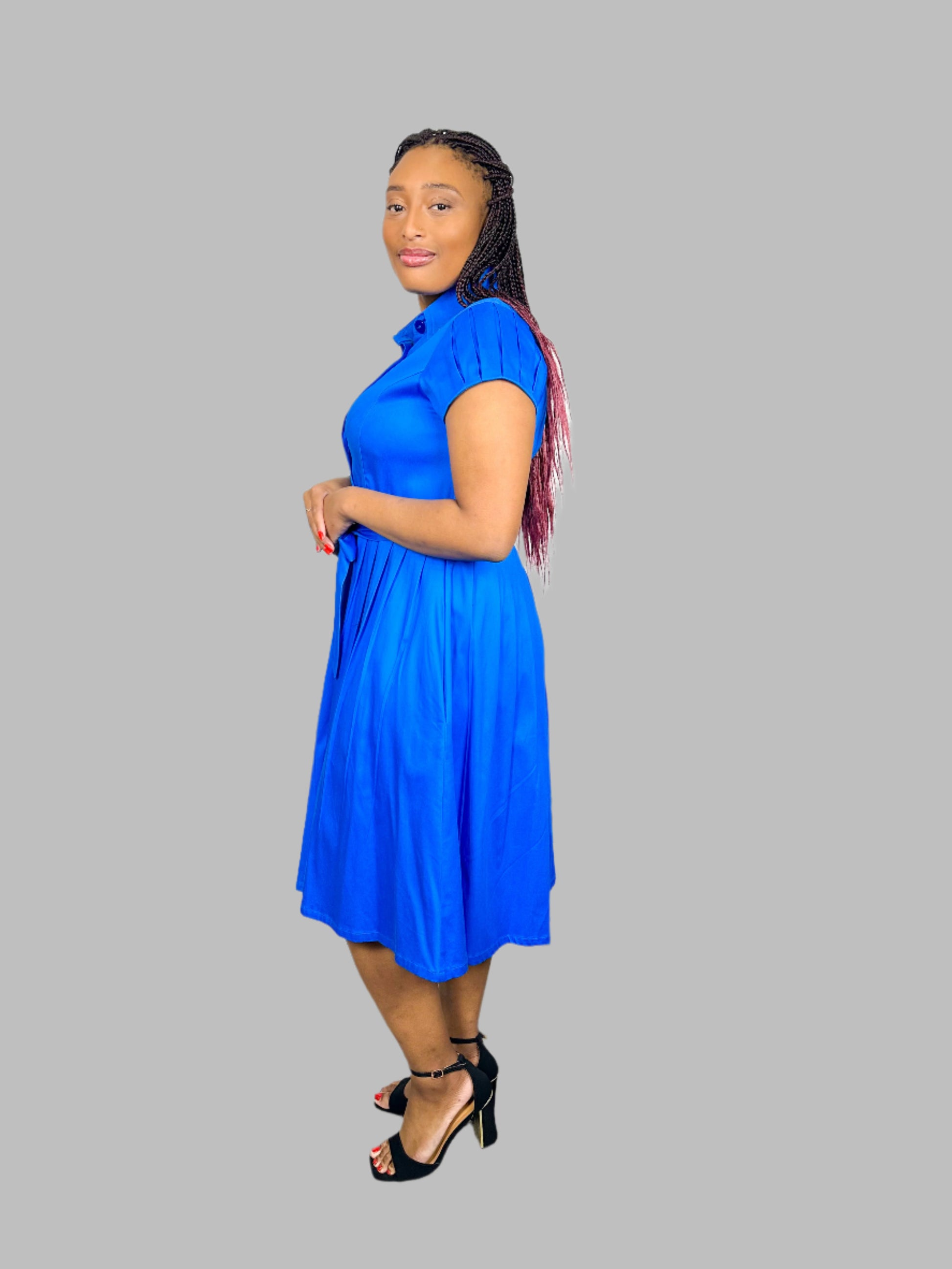 Our ROYAL BLUE SHORT SLEEVED PLEATED DRESS is crafted with precision, this elegant knee-length dress showcases a flattering pleated design for a touch of sophistication. This dress features short, pleated dress, inseam pockets, pleated bottom, shirt collar, A-line design, waist belt. Perfect for any occasion, elevate your wardrobe with this luxury piece.