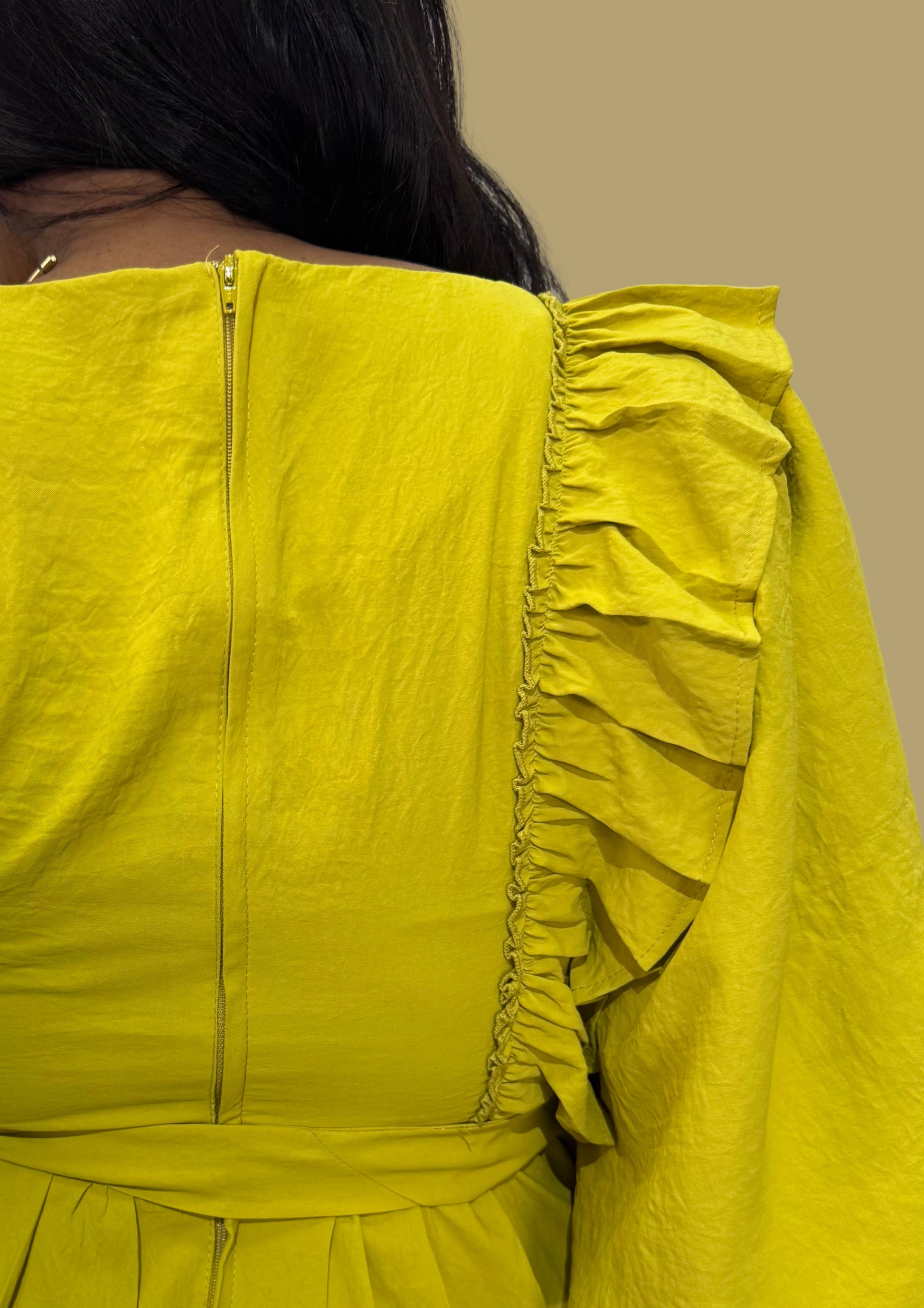 A bold and elegant statement piece, designed for comfort and versatility with a touch of drama. Made from stretch polyester for a flattering fit, V-neckline at the front, and dramatic 3/4 bubble sleeves with frills along the shoulder. It features a defined waistline with a matching belt and inseam pockets for added practicality. Stylish high-low hemline with central frill and horizontal pleats, back zip closure for easy wear. It is perfect for work, church, and everyday occasions.