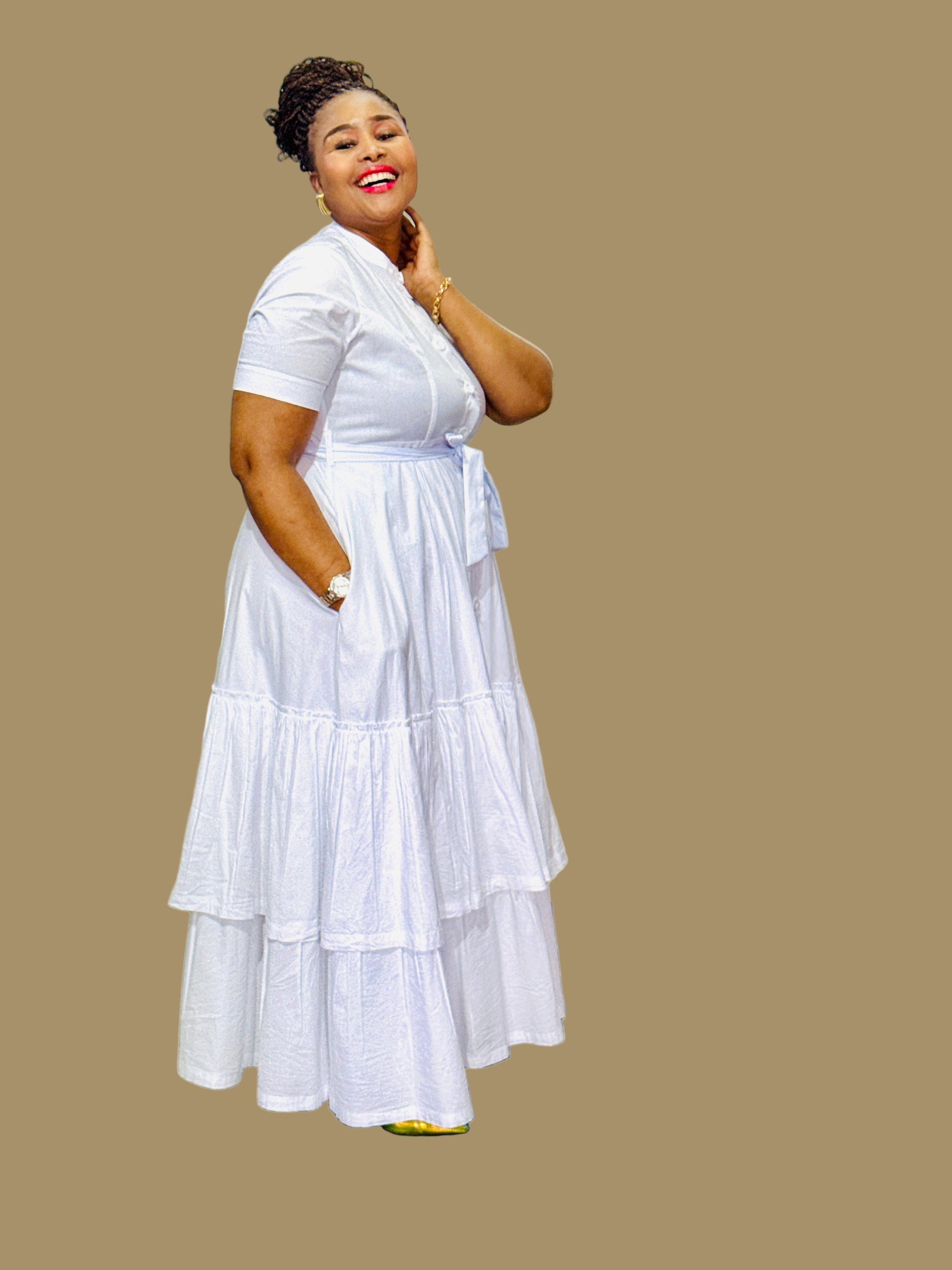 A timeless maxi crafted in 97% cotton and 3% spandex. Features long sleeves, front buttons, belt, inseam pockets, lining, and two bottom frills for an elegant finish. Suitable for weddings, church, or everyday sophistication.