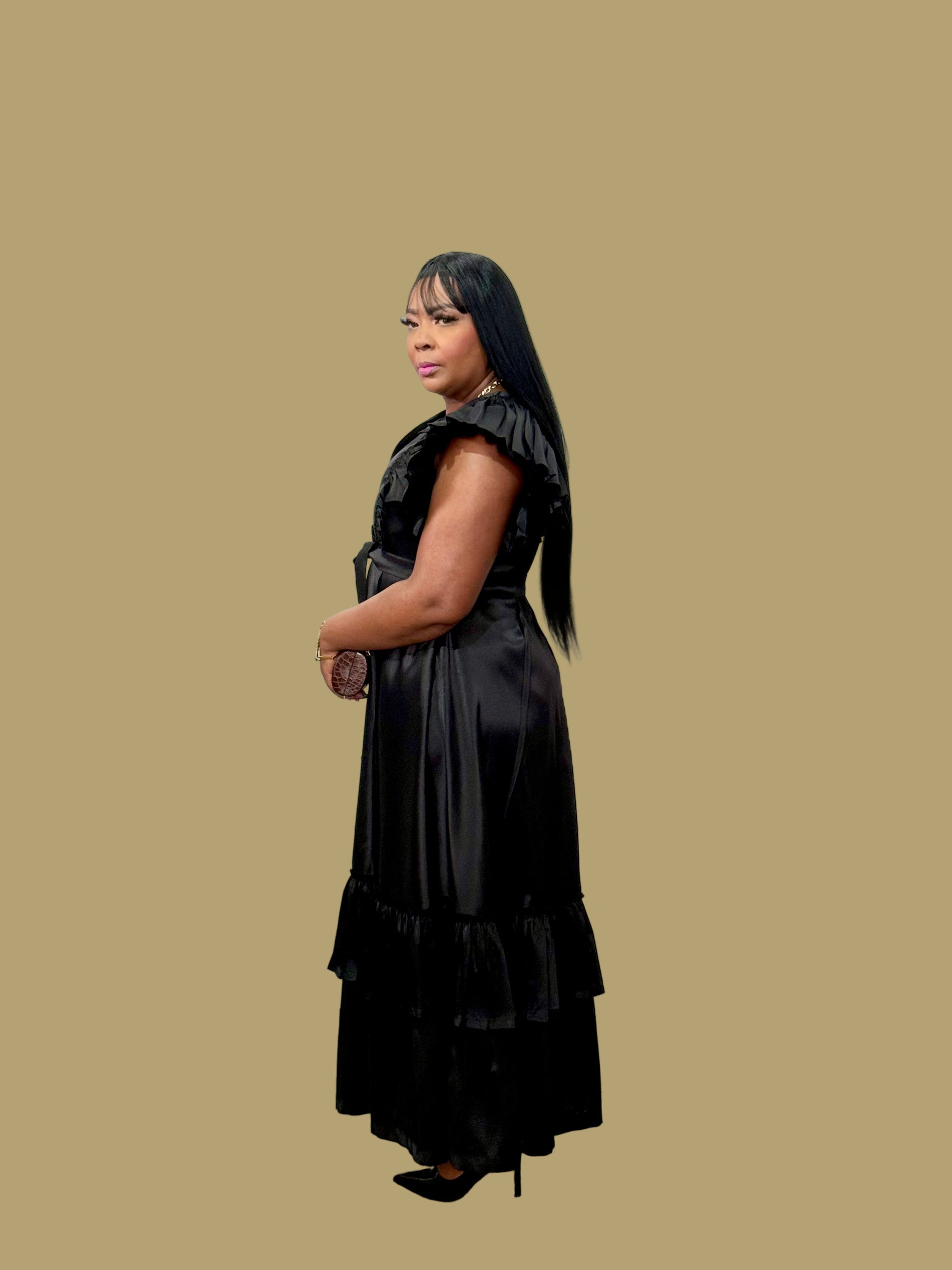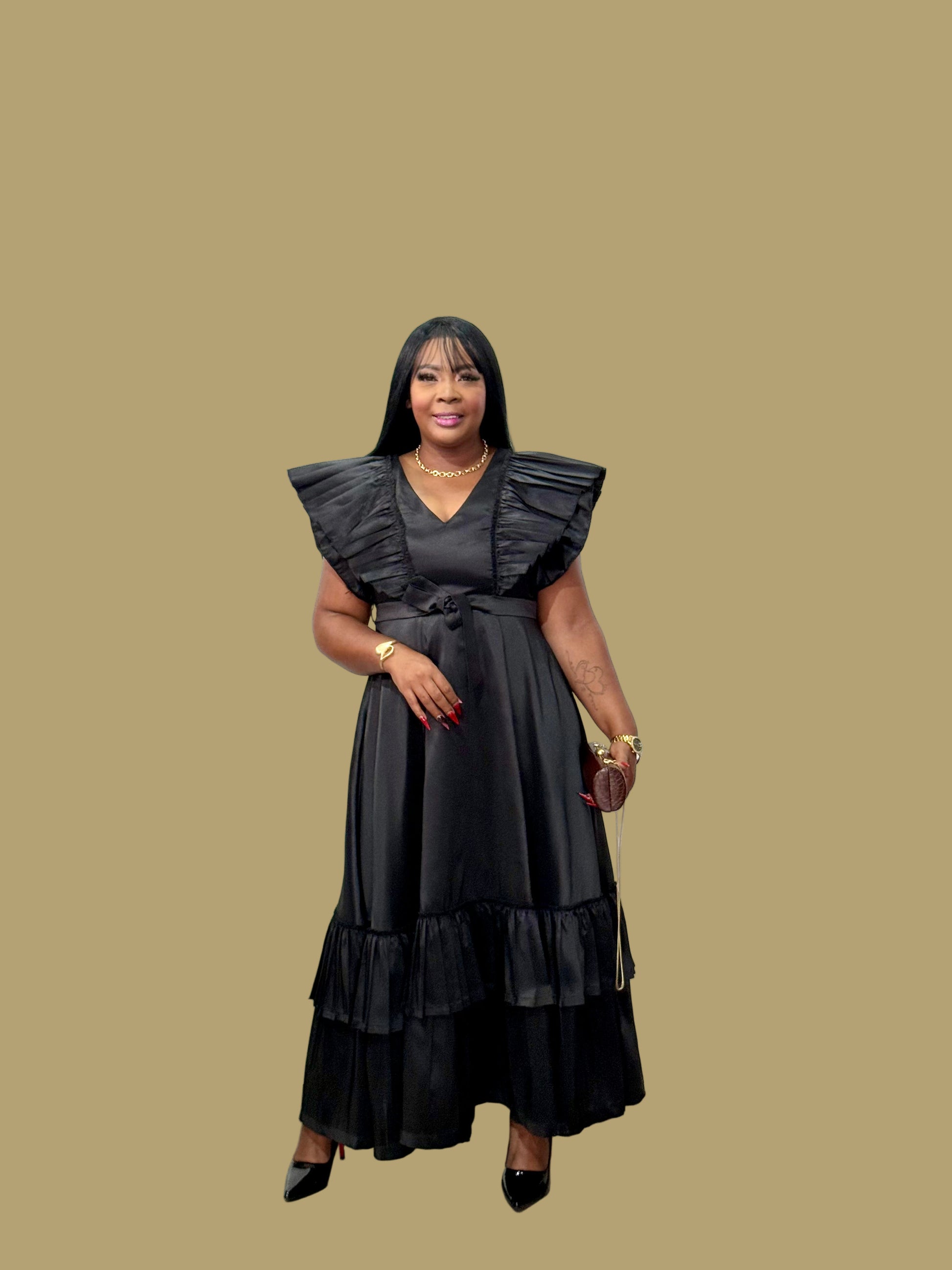 This black maxi dress is crafted from rich duchess fabric, offering a timeless and refined silhouette. A graceful V-neckline sets the tone, while soft frill detailing flows effortlessly from the front bodice to the back, adding texture and feminine charm. The waist is elegantly defined with a matching belt, enhancing the figure before falling into a full, flared skirt that moves with poise. Finished with a concealed back zipper for a seamless fit, this gown is the epitome of understated glamour. Ideal for formal evenings and elegant affairs.