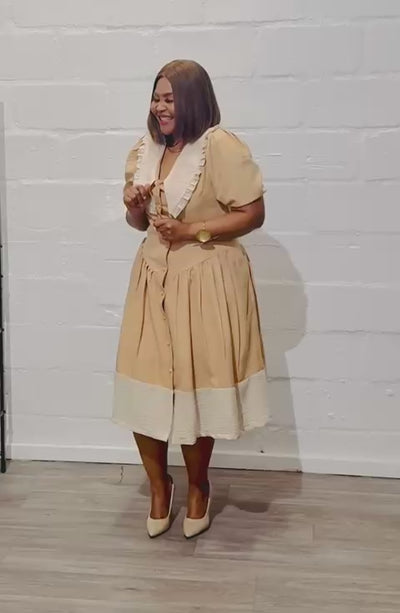 Crafted from premium Turkish linen, this midi dress features short bubble sleeves and a flattering A-line bodice with a V-neck. It features a white V-shaped frilled collar, a flared hem with convenient inseam pockets, and a contrasting cream panel at the bottom for an elegant touch. Ideal for weddings, church, work, or any formal occasion.