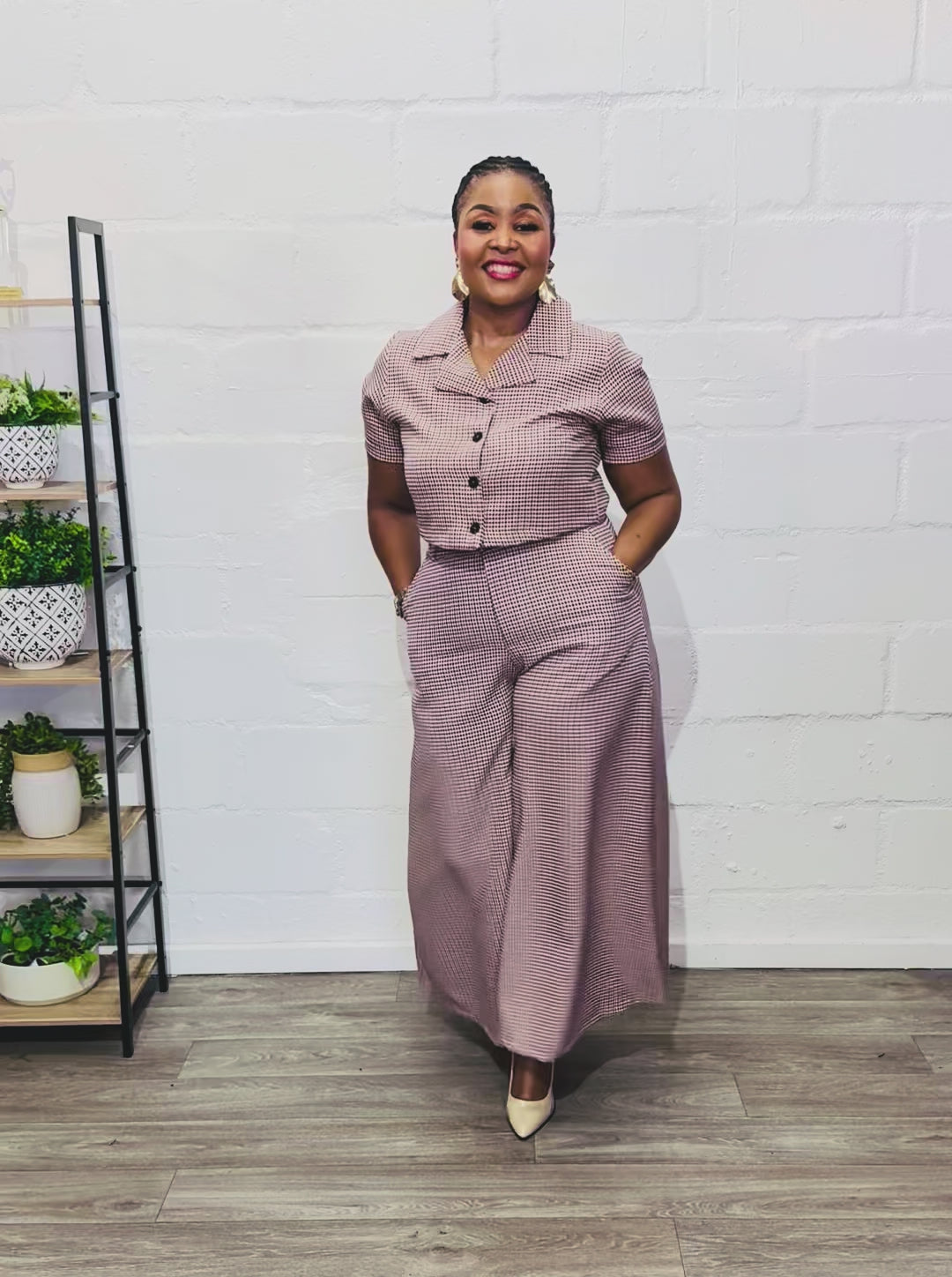 This 100% cotton 2-piece set delivers timeless sophistication with a modern edge. The tailored pants feature wide legs, front pockets, and a neat zip-and-button closure, while the cropped top with a collar and front buttons adds a sharp, waistcoat-inspired silhouette. Designed to balance structure and ease, it’s the ideal ensemble for formal office wear or chic occasions