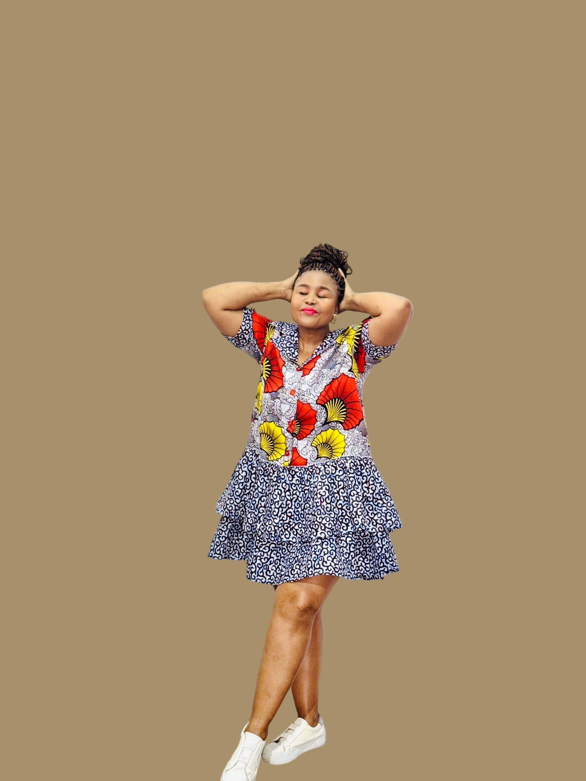 A knee-length Ankara shirt dress with short sleeves, front buttons, shirt collar, contrast fabric on cuffs, collar, and hem frills, plus inseam pockets. Stylish yet practical for church, traditional events, gatherings, weekends, and work.
