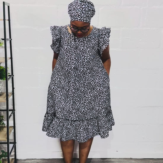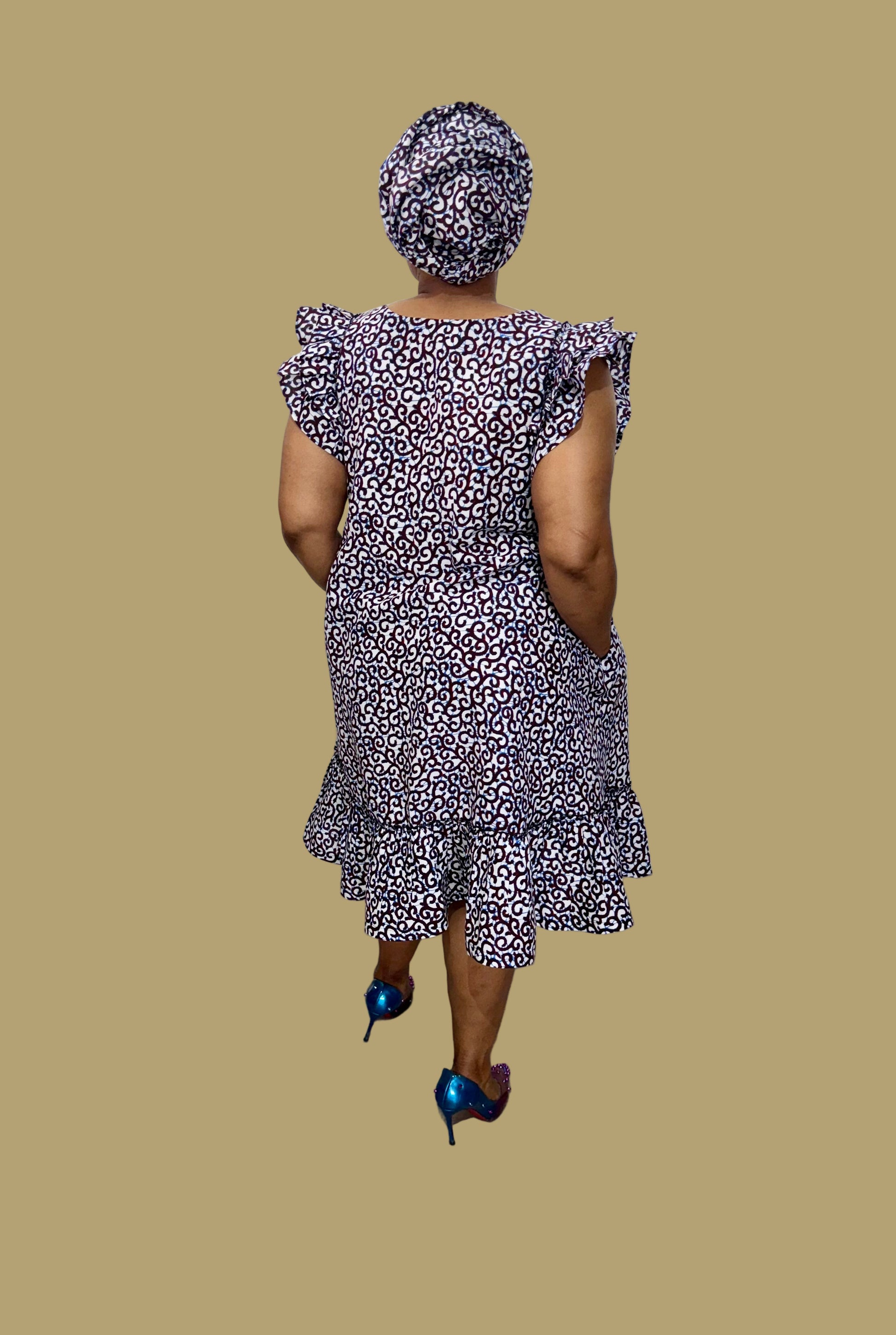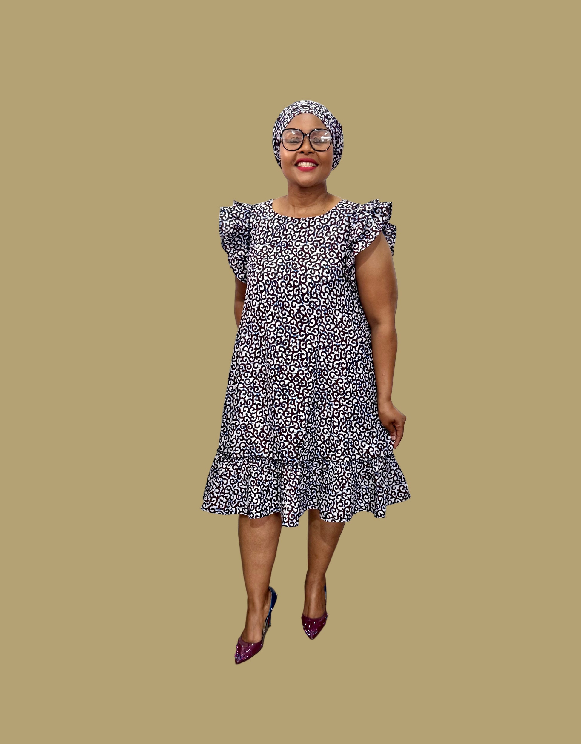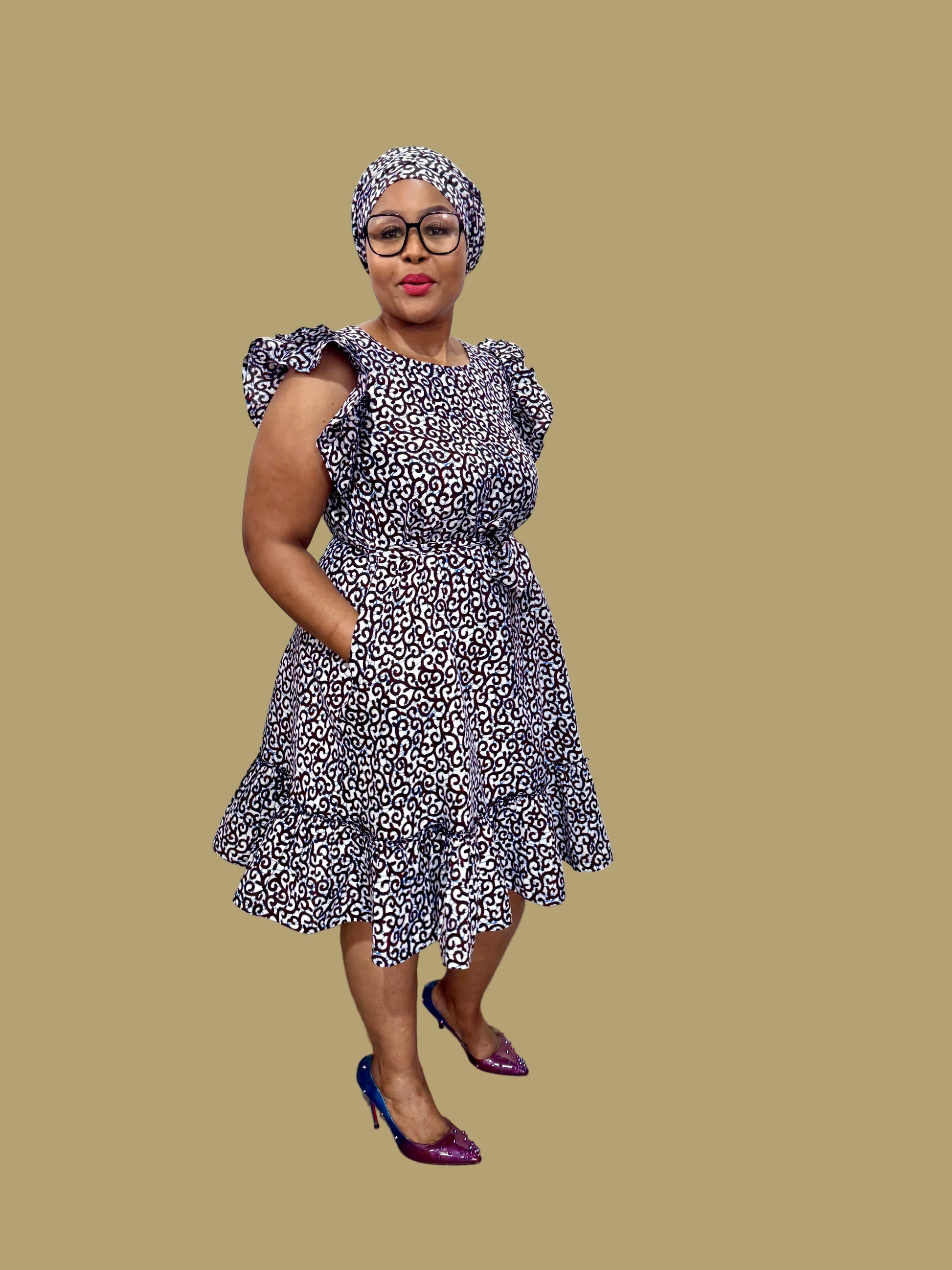 A versatile midi dress that blends comfort with elegance — perfect for everyday wear or special occasions. Crafted from 100% Ankara cotton. It features a round neckline with short frilled sleeves, playful bottom frill for extra charm and inseam pockets for convenience. It has a matching belt to define the waist. Suitable for traditional gatherings, weddings, church, or daily wear.