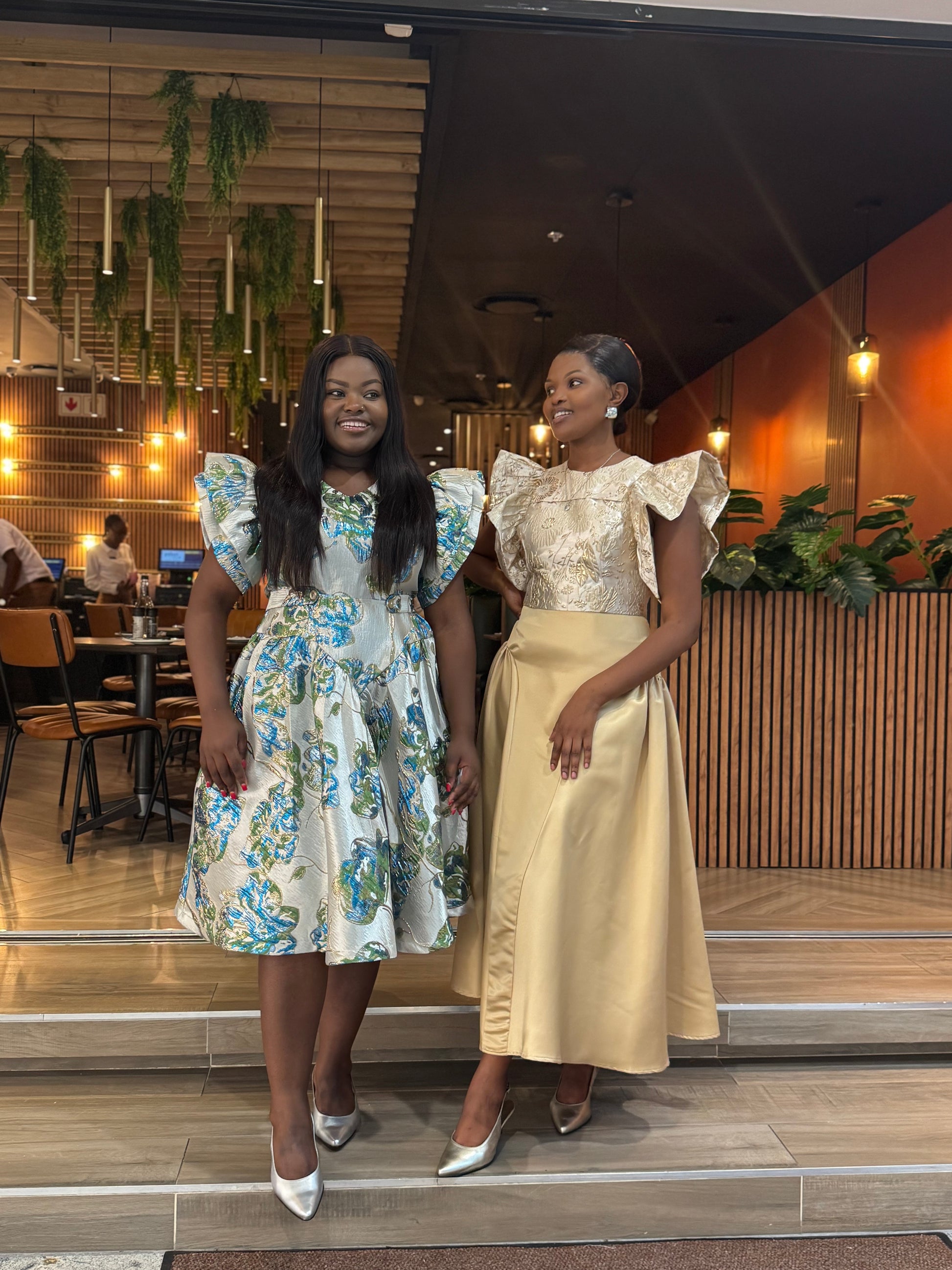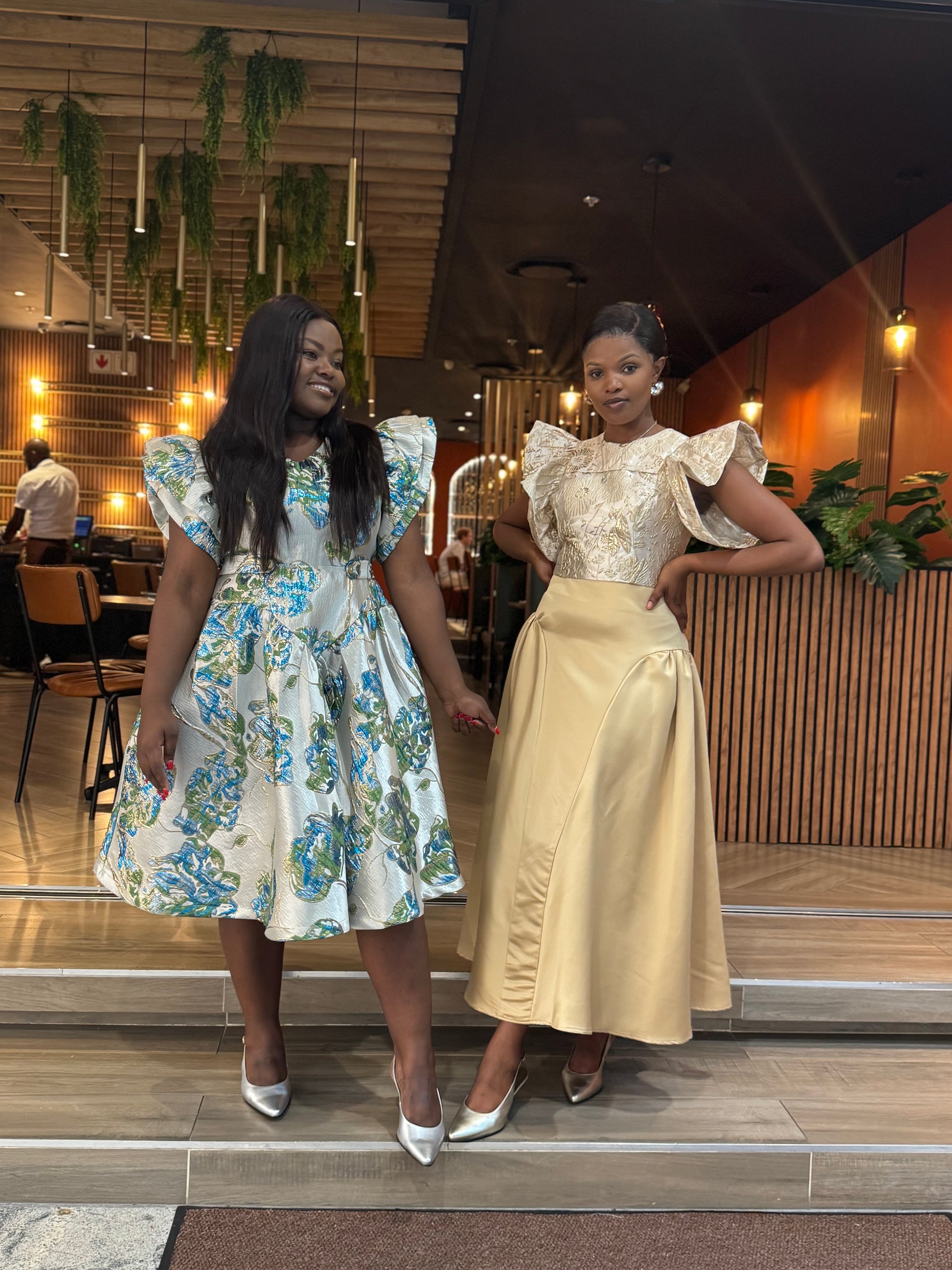 | This dress is made of 80% DTY and 20% lurex fabric. This A-line dress with a fitted bodice has detachable belt to that one has the option to accentuate their waist or not, as well as a back zip, big and round sleeves as well as a tee-yoke flared bottom in tee. Best suitable for weddings as well as other special occassions, paired with your favourite gold/silver pair of heels. |